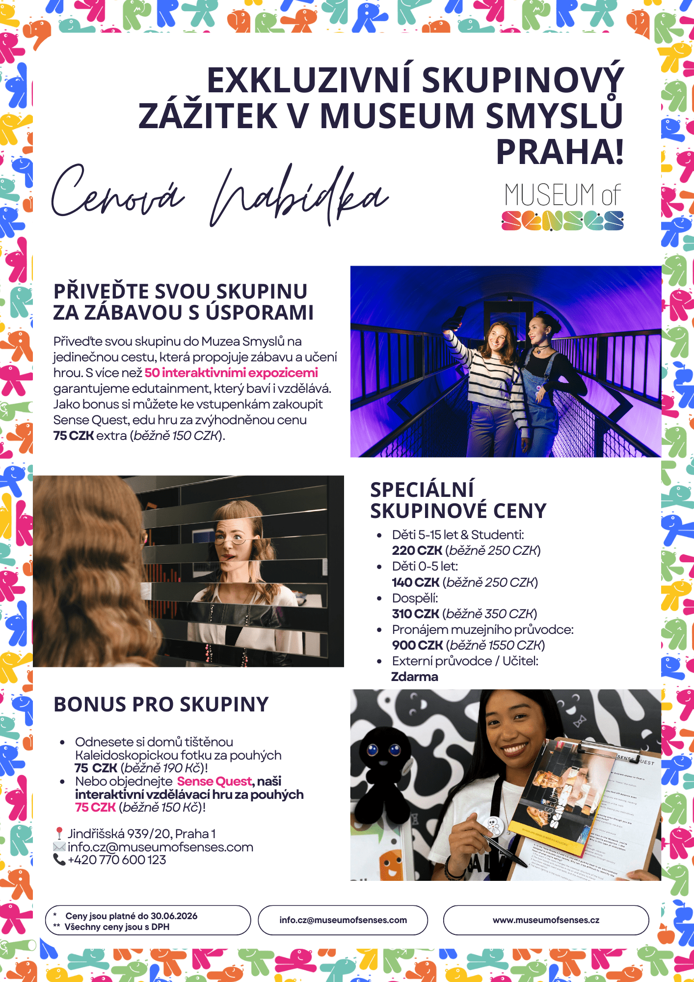 Ponořte se do prozkoumávání muzea ve vlastní skupině! Ať už plánujete školní výlet, firemní akci nebo soukromou prohlídku, nabízíme zážitky na míru vašim potřebám. Užijte si komentované prohlídky s průvodcem, interaktivní expozice a speciální ceny pro skupiny od 10 osob. Máte odvahu prožít skupinově víc? Napište nám na info.cz@museumofsenses.com a domluvte si skupinovou návštěvu, která vás překvapí!